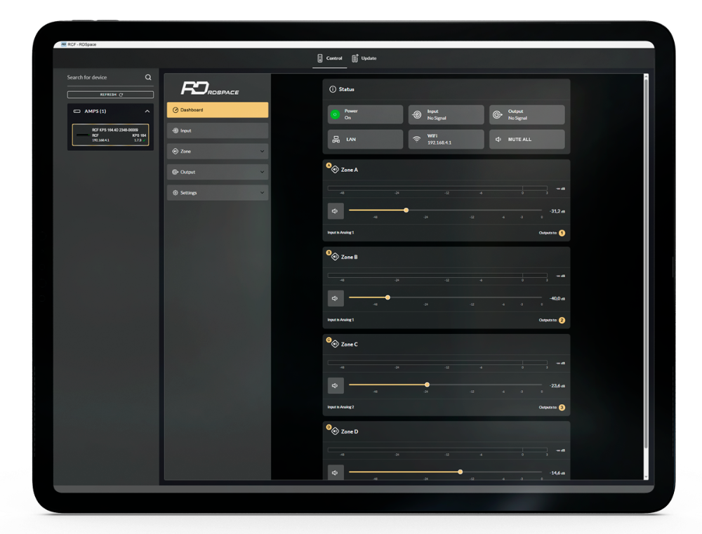 強力DSP搭載のため、精密で最適化された信号処理と完全なI/Oマトリックス管理が実現します。RCFスピーカー用プリセット搭載のKPSアンプは、実用性の高いソリューションです。構成はRDSpaceソフトウェア(デスクトップアプリまたはモバイルデバイスからもアクセス可能なブラウザ版)からアクセスします。ネイティブWi-Fi接続と統合されたワイヤレスアクセスポイントにより、直接デバイスにアクセスでき、ネットワークスイッチや外部アクセスポイント不要で構成が可能です。