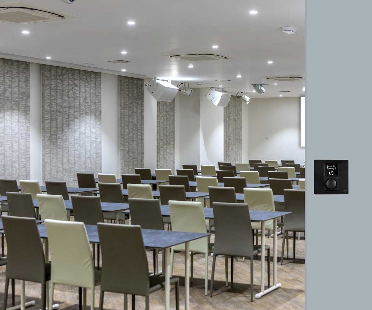 RC KPSは、KPSアンプ用に設計された壁面設置型のネットワーク対応PoEコントローラーで、入力選択および音量調整が可能です。本体はタッチ操作に適したマット仕上げの高性能ポリマー素材で、ネジが表から見えないスタイリッシュなデザインです。さらに、ダークモード/ライトモード、輝度設定、ボタンバックライトオプション、RDSpaceを介したネットワークへの即時ペアリングおよび設定にも対応します。